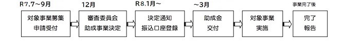 | 7.審査結果 | 当委員会の審査委員会(12月開催予定)で決定し、文書でお知らせします。また、当委員会のホームページにて支給団体名を広報します。 |